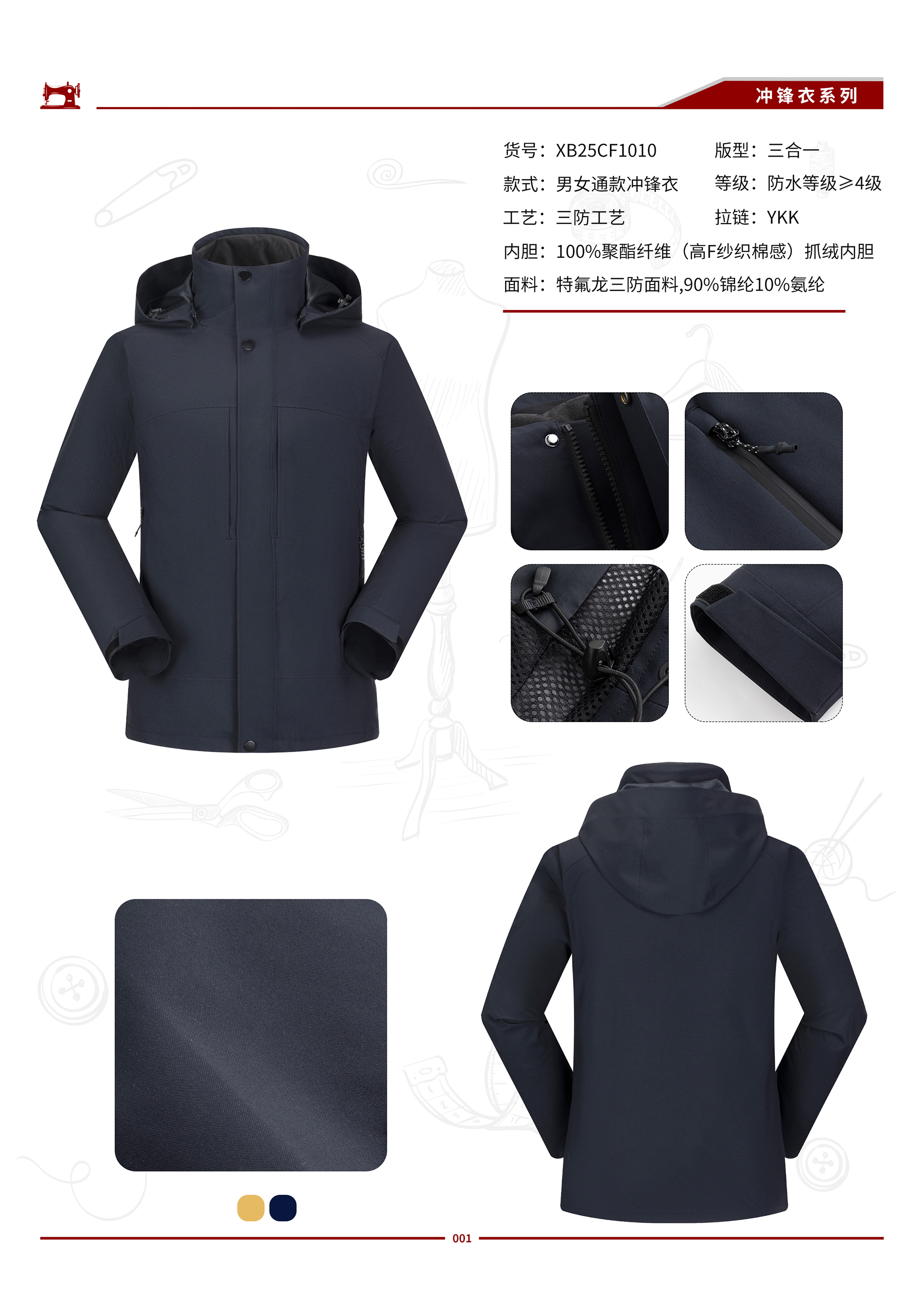 工艺 防水10000/透气10000/插肩袖/一衣三穿/YKK拉链