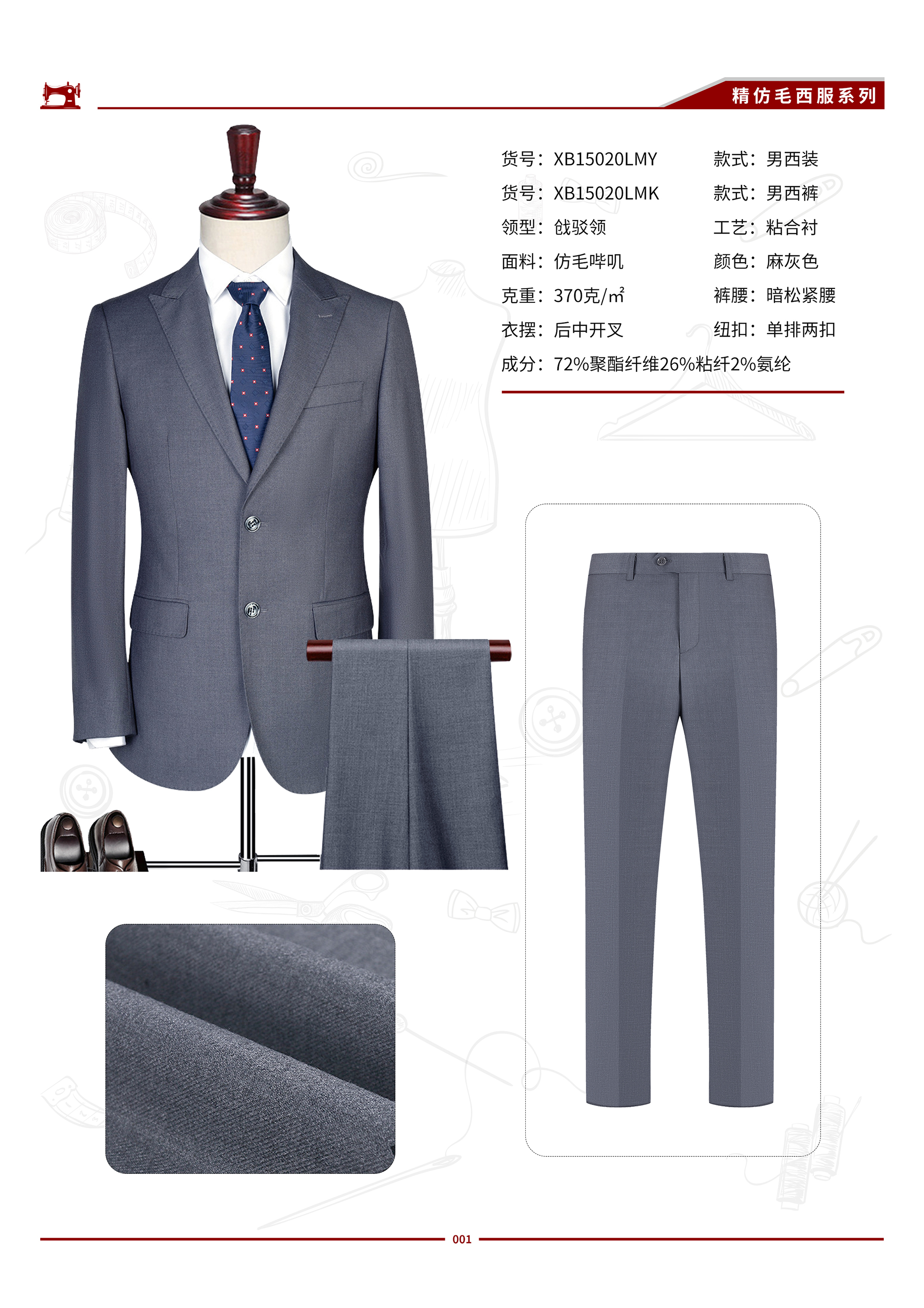 XB15020LM 男士仿毛戗驳领灰色西服
